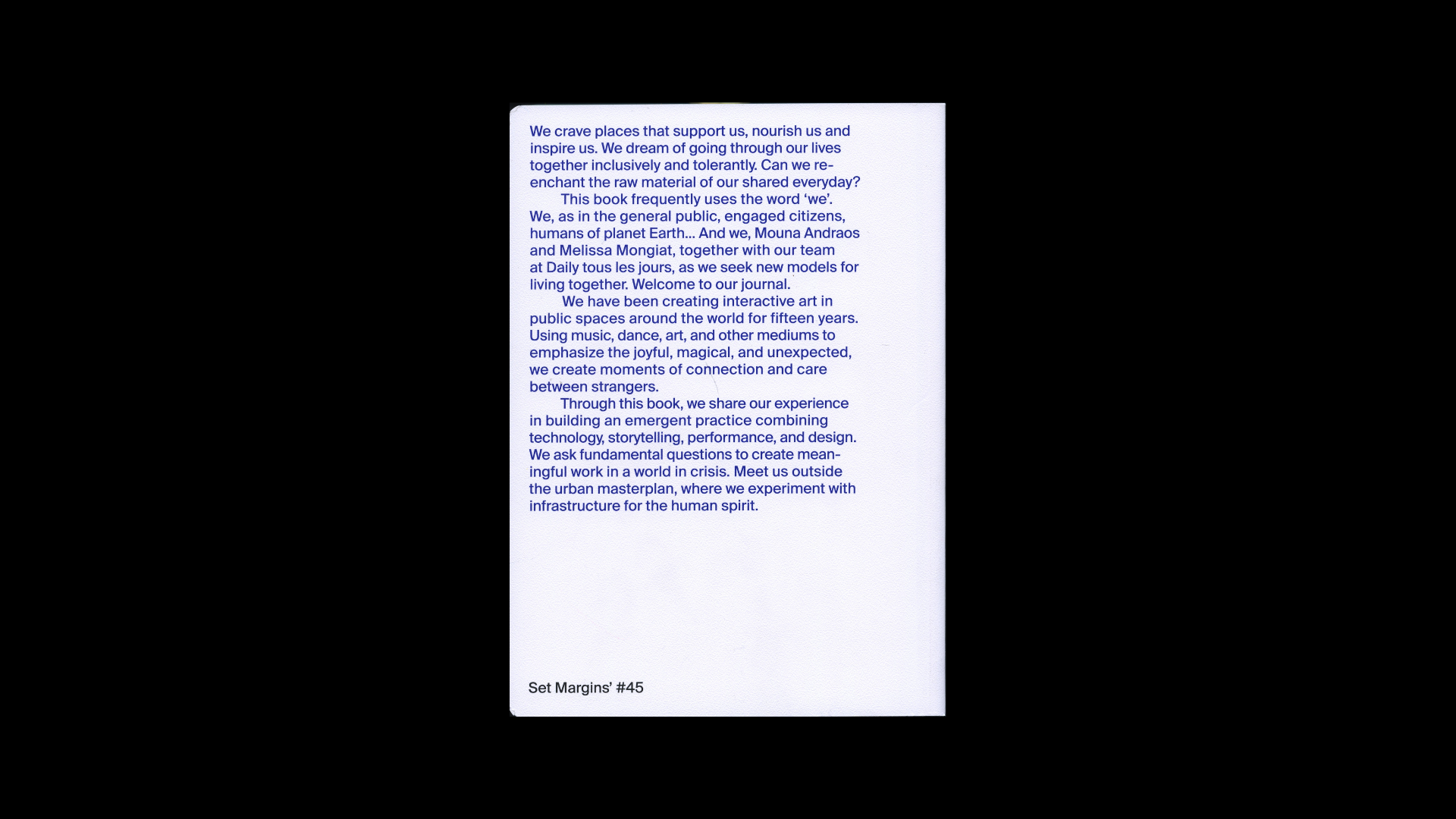 “We” in this book refers both to all of us as citizens of Earth, and to Mouna Andraos and Melissa Mongiat, along with their team at the Montreal-based art and design studio Daily tous les jours, as they explore new ways of living together. It is an invitation into their journal. For over fifteen years, the studio has created interactive public art around the world, using music, movement, and storytelling to spark connection, joy, and care among strangers. Through this book, an evolving practice is shared that blends technology, design, and performance to ask deeper questions and imagine new forms of collective life, beyond the urban masterplan and towards infrastructure for the human spirit.
